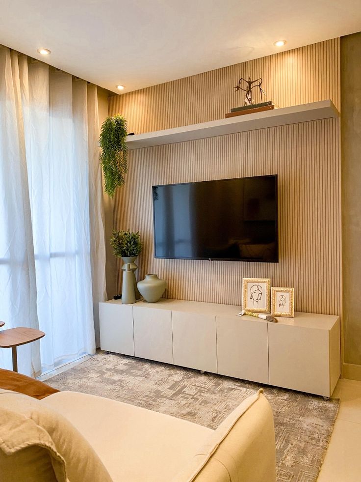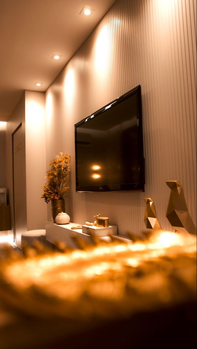 Esse é um erro comum. Muitas pessoas instalam spots sobre a TV, mas o resultado é uma iluminação estranha e reflexos indesejados na tela. A dica é sempre optar pelas laterais, que trazem aconchego sem interferir na imagem.