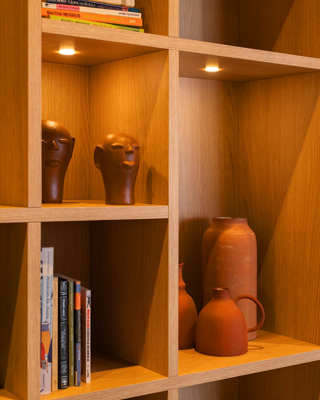 ✨ Dentro de móveis – Alguns modelos menores em armários e prateleiras ajudam a destacar objetos decorativos.